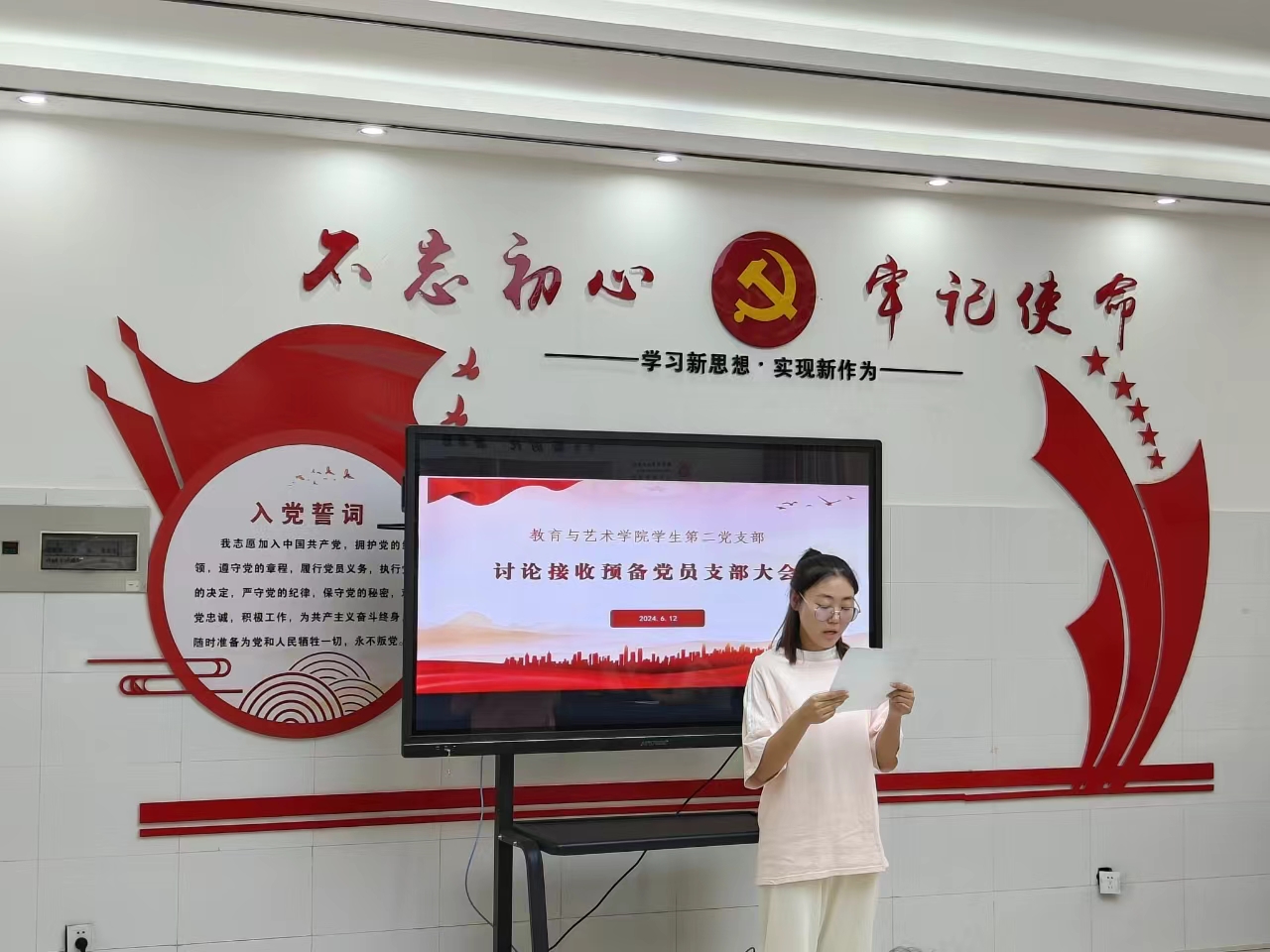 会议伊始,18名发展对象依次进行发言,分别从入党动机、思想认识、自身学习、工作态度以及品德修养等方面向党组织汇报自身情况。经过无记名投票,全体与会党员一致同意陈子仪等18名发展对象成为预备党员。会后,支部书记又带领18名新发展的预备党员面对党旗进行了庄严宣誓。秦春风对新发展的预备党员表示祝贺,并提出三点希望:要求:一、不忘初心,跟党走;二、遵纪守法、严要求;三、勇于担当,展风采。