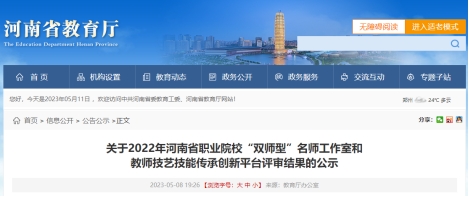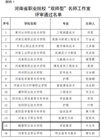 近日,河南省教育厅办公室发布《关于公布2022年度河南省职业院校“双师型”名师工作室和教师技艺技能传承创新平台名单的通知》(教职成函〔2022〕641号),公司牛志华教授团队的学前教育专业获批河南省职业院校“双师型”名师工作室。