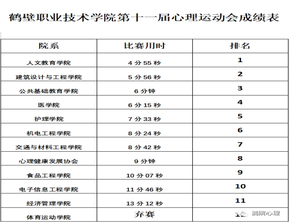 11月1日下午,公司开展第十一届心理运动会,本届心理健康运动会共11个院系代表队参加,包括盲行、两人三足、呼啦圈过山车、书写未来等七个项目,为使新同学能够快速适应老员工活,避免产生焦躁、压抑等情绪,人文教育学院选拔了十名2023级新生参加。